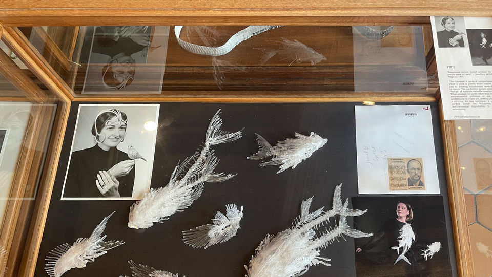 Extranalities No13: Pictureware 4 at Château Grimaldi in Cagnes-sur-Mer, France. In the portraitroom of Suzy Solidor 2nd – 5th of May 2024 Destination Bijou is a jewellery event organized by the city of Cagnes-sur-Mer and Isabelle Busnell, Sebastien Carré, Juan Riusech. Extranalities is a group of jewellery artists who challenge each other with unusual assignments. For this exhibition we used old American newspaper photos, in which jewellery played a starring role, as inspiration for new work: Pictureware. Artists: Herman Hermsen , Timothy Information Limited , Peter Vermandere , Felieke van der Leest , Sofia Björkman , Denise Reytan , Sara Gackowska , Christoph Zellweger, Catarina Silva Sofia Björkman Statement: On the back of a press photography from 1976, I read an excerpt from an article: “Sometimes nature doesn’t produce the perfection people seem to want”. On another photo there is beautiful woman wearing a head piece made of metal wire which winds around the head like a helmet. In her hand she holds a bird. On Wikipedia I read that environmental degradation is a technological externality. The woman on the picture is artist Mary Lee Hu, who I got to know in Munich when she came to the opening of the exhibition when it was shown there, without knowing about the project.